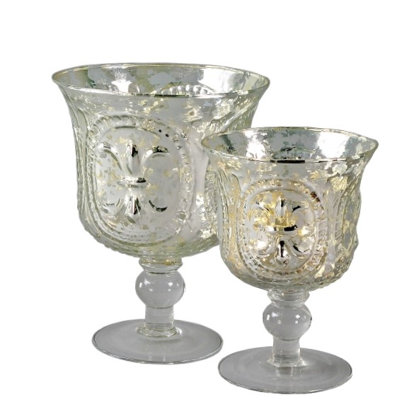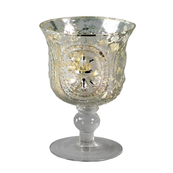 Dieser edle Kelch besticht durch seine aufwendige Verarbeitung. Durch das Bauernsilber-Design und das Gravurmuster zaubert dieses Windlicht einen funkelnden Lichtschein. Es ist ein wunderschönes Accessoire zum aktuellen Shabby-Chic, Landhaus- und Vintage-Look.