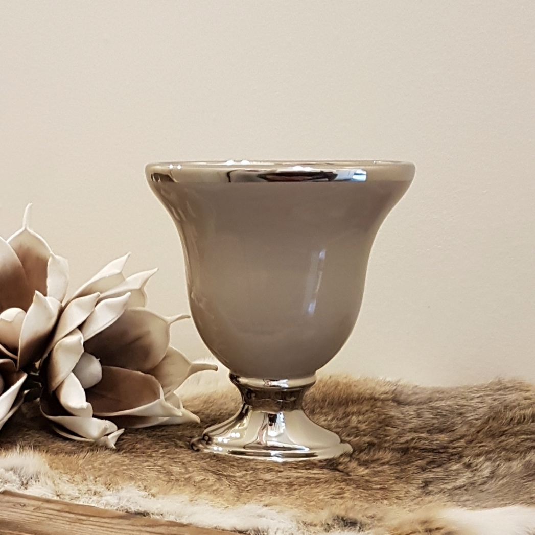 Elegante kleine Vase aus taupe-farbener Keramik mit silbernem Standfuß und silbernem Rand.