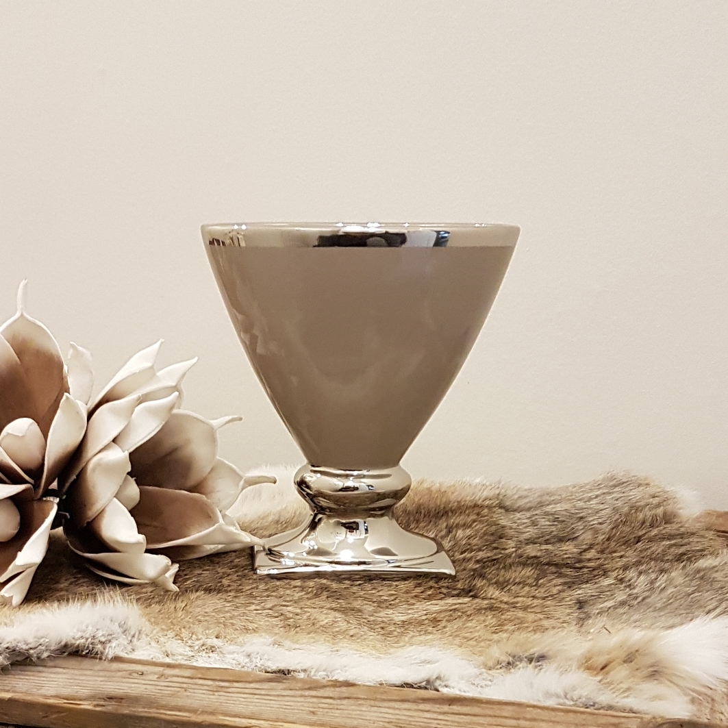 Elegante kleine Vase aus taupe-farbener Keramik mit silbernem Standfuß und silbernem Rand.