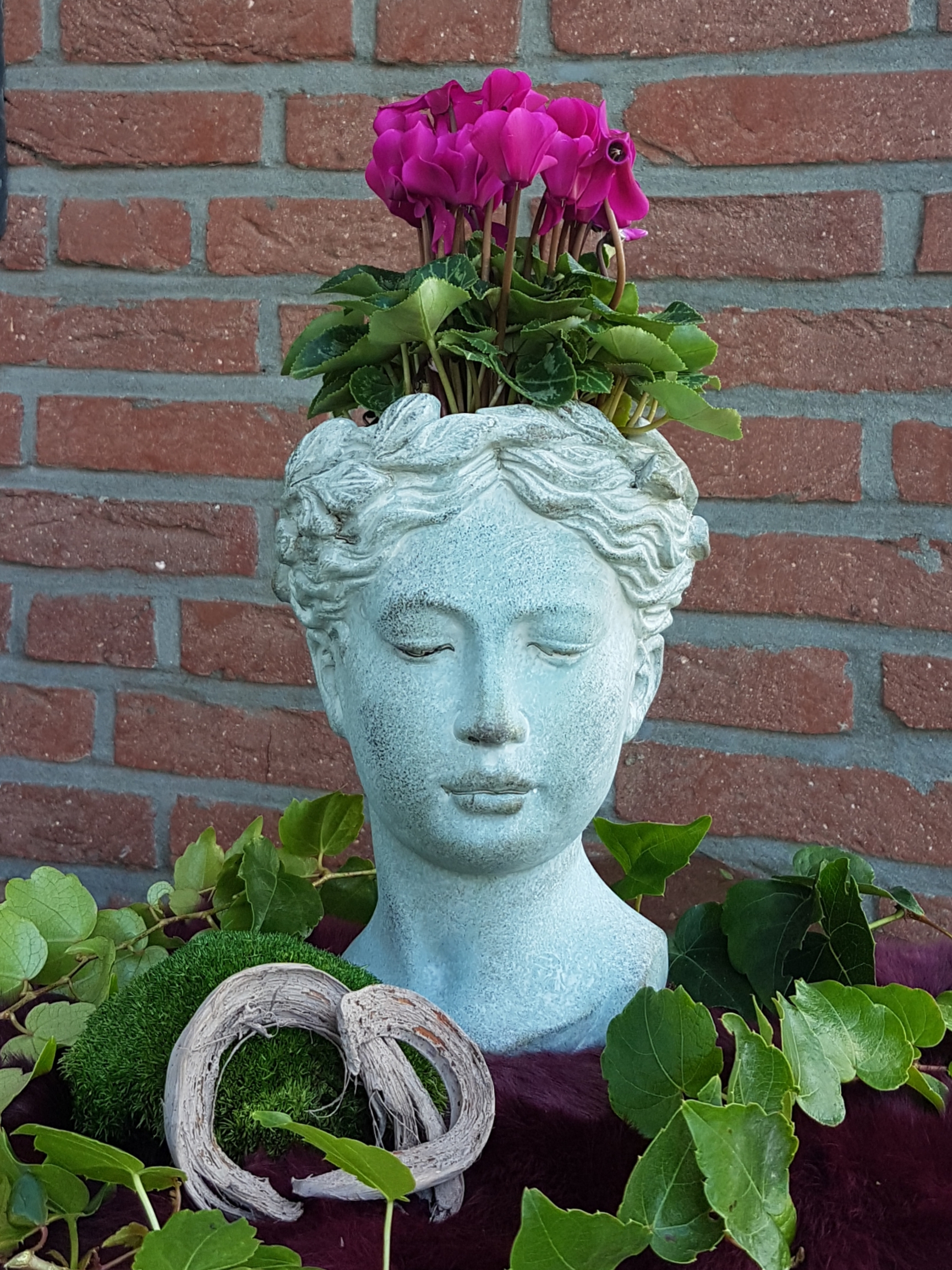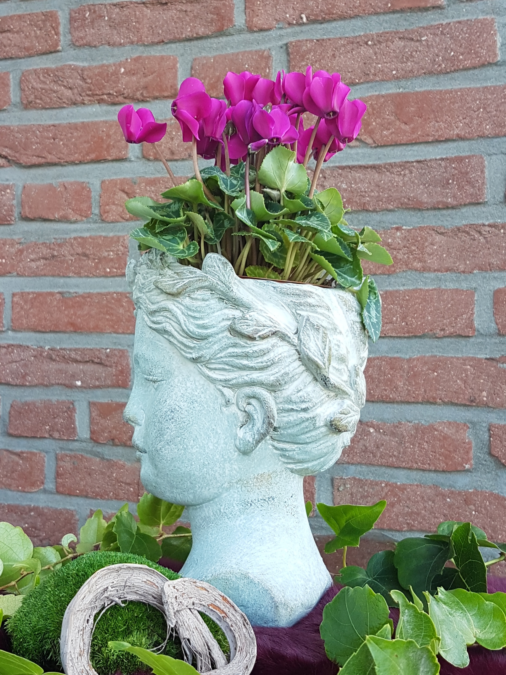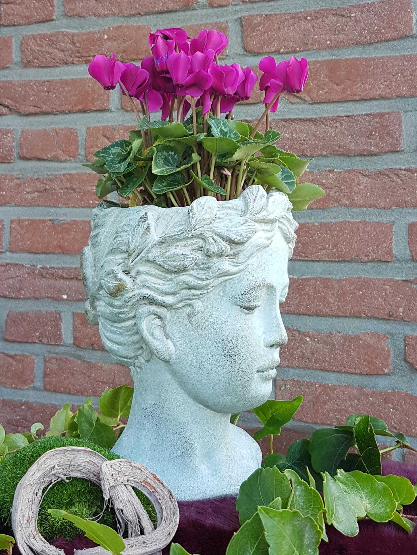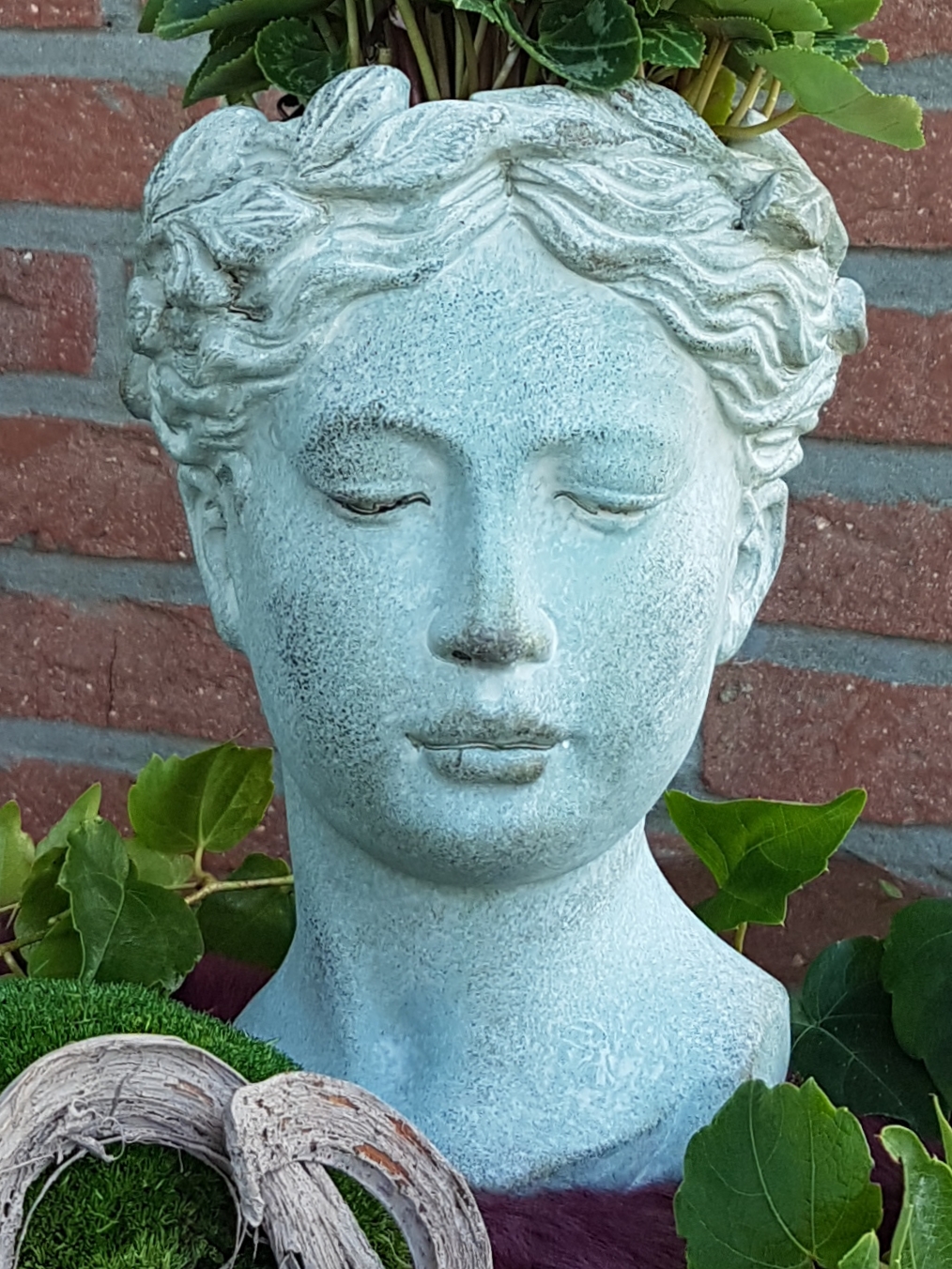 Wunderschöne Pflanzbüste mit Kranzdekor in grau-grün