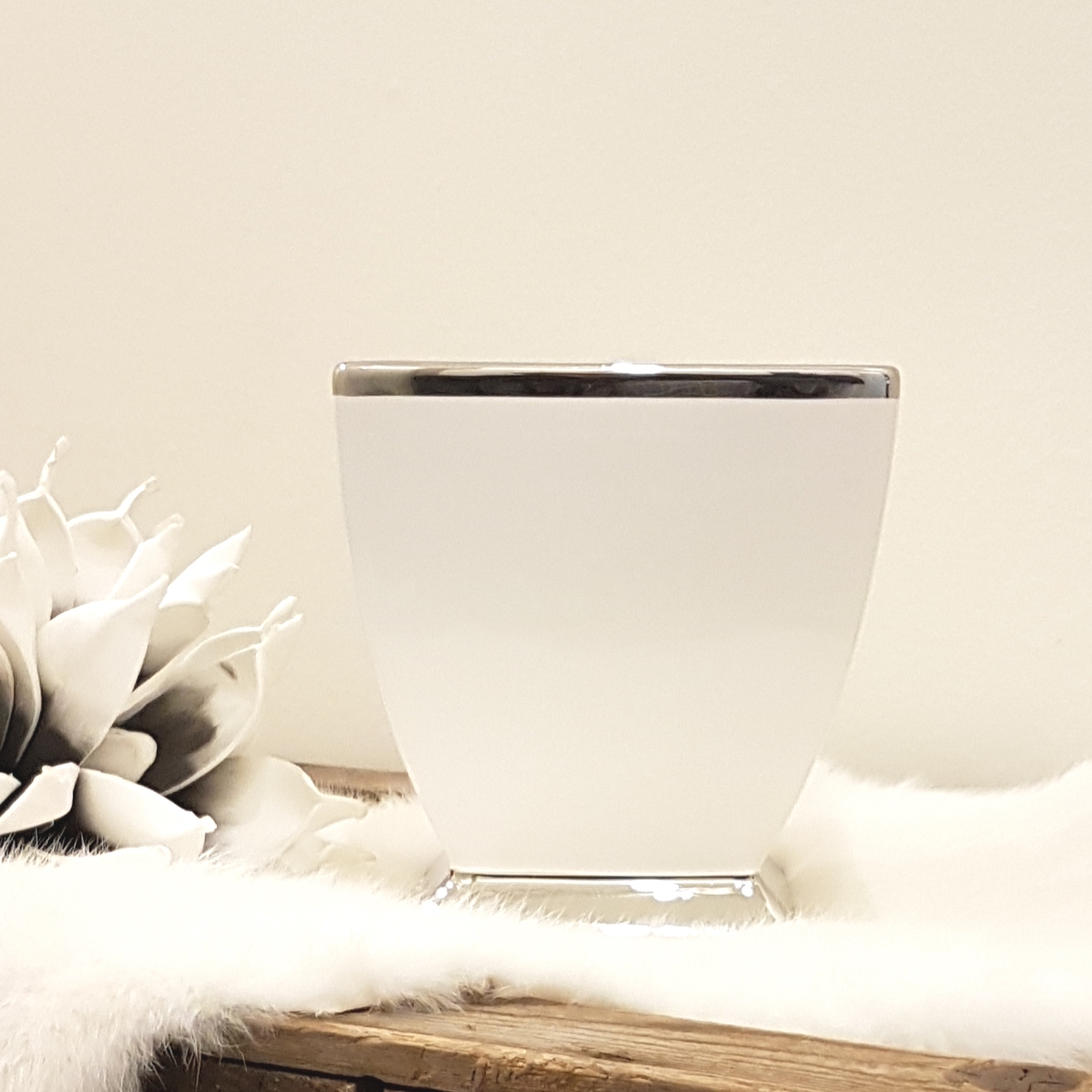 Elegante Vase aus weißer Keramik mit silbernem Standfuß und silbernem Rand.